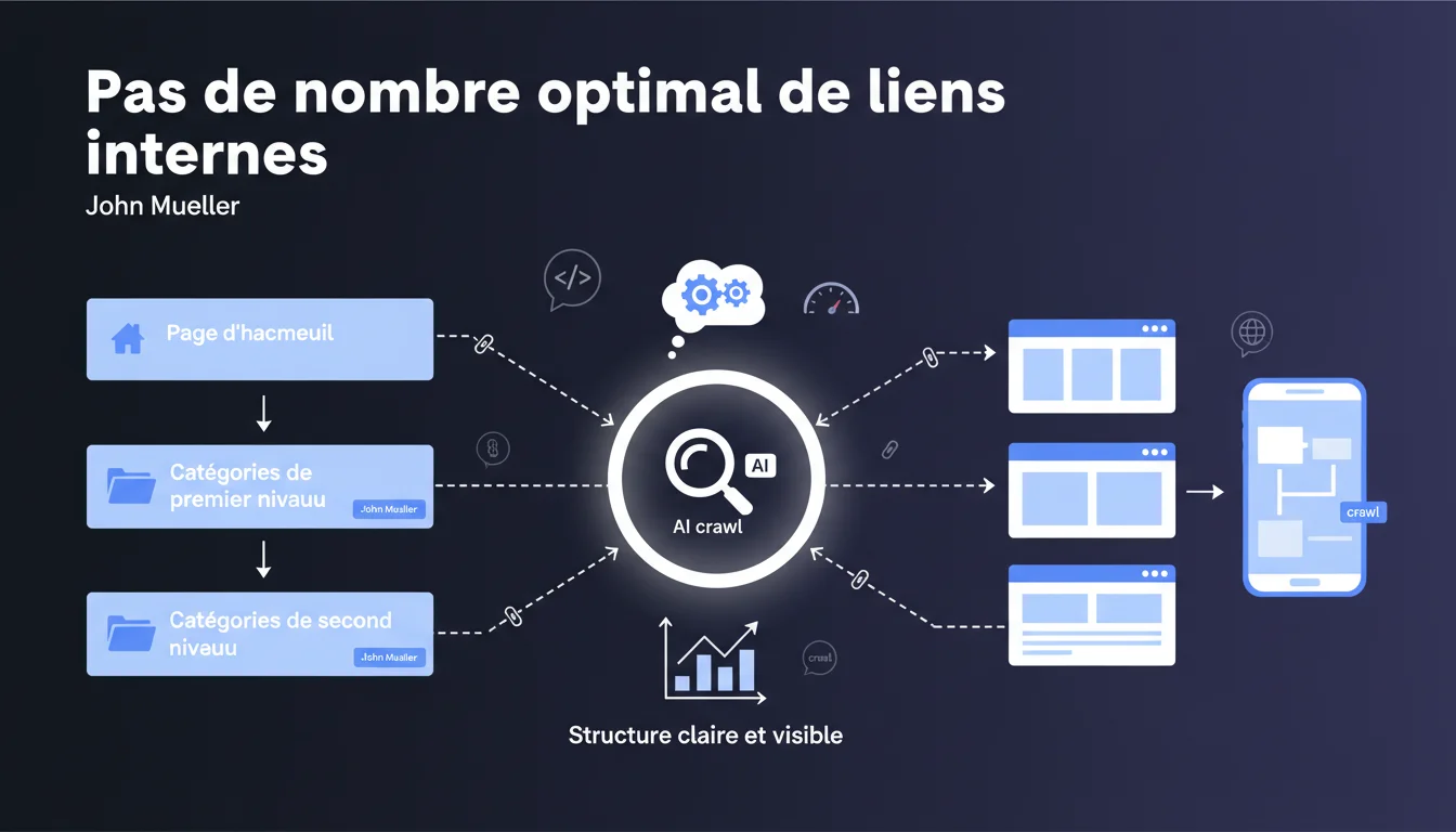 Google affirme qu'il n'existe aucun nombre optimal de liens internes par page. Ce qui compte réellement : la clarté de votre architecture de site lors du crawl. Les robots doivent identifier instantanément la hiérarchie (homepage, catégories primaires, sous-catégories) sans ambiguïté.