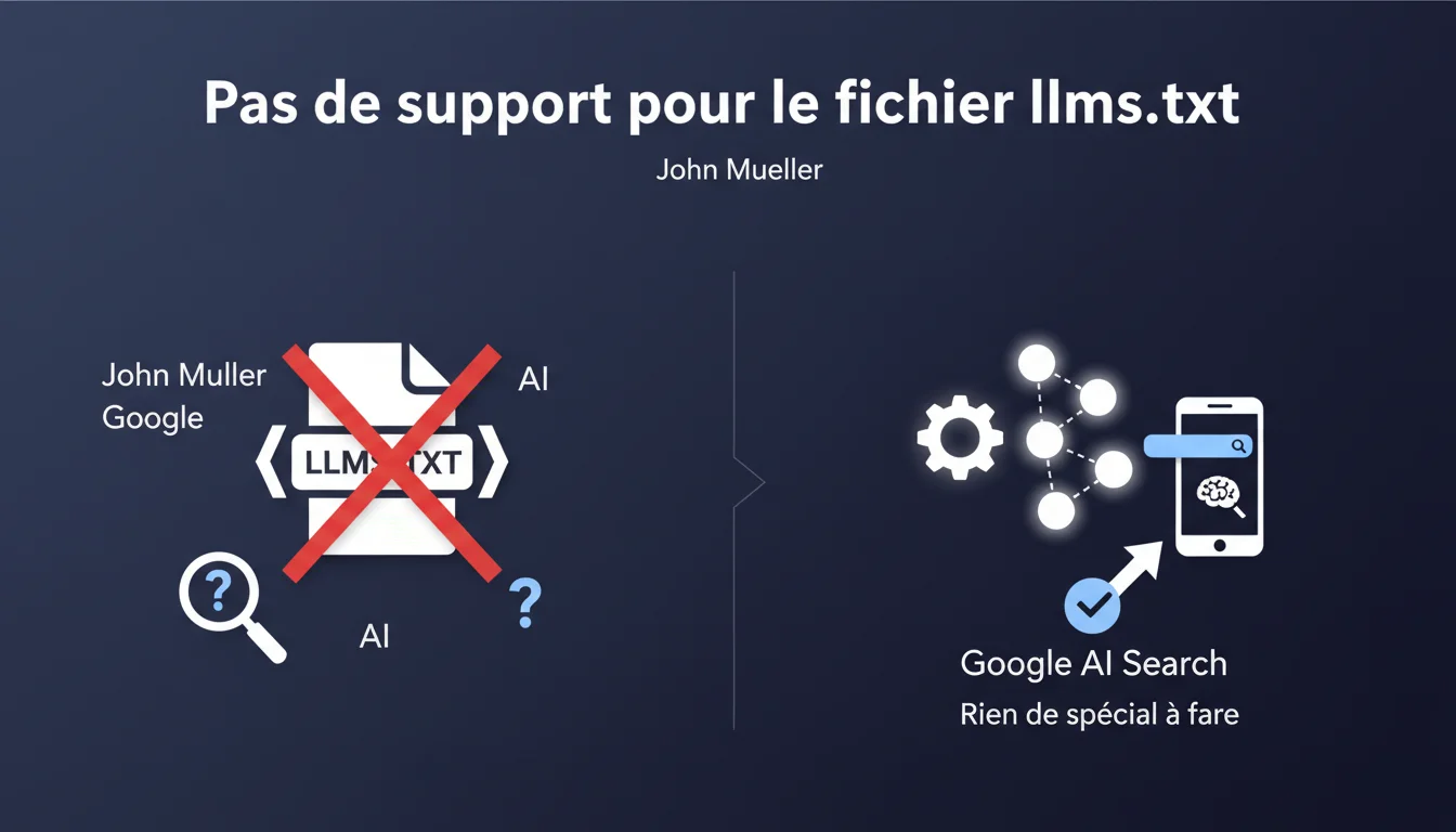 Mueller est catégorique : Google n'utilise pas llms.txt pour alimenter ses AI Overviews ou toute autre fonctionnalité de recherche basée sur l'IA. Le message est limpide — vous n'avez rien de spécial à faire au-delà de ce qui garantit déjà votre indexation classique.