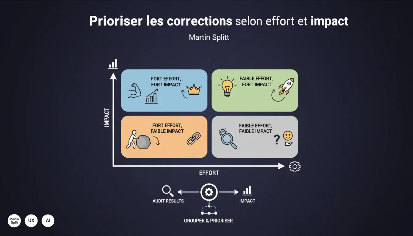 Il s'agit de cartographier chaque recommandation d'audit sur deux dimensions. L'axe vertical représente l'impact estimé (trafic, conversions, expérience utilisateur). L'axe horizontal mesure l'effort requis (temps dev, risques techniques, ressources mobilisées).