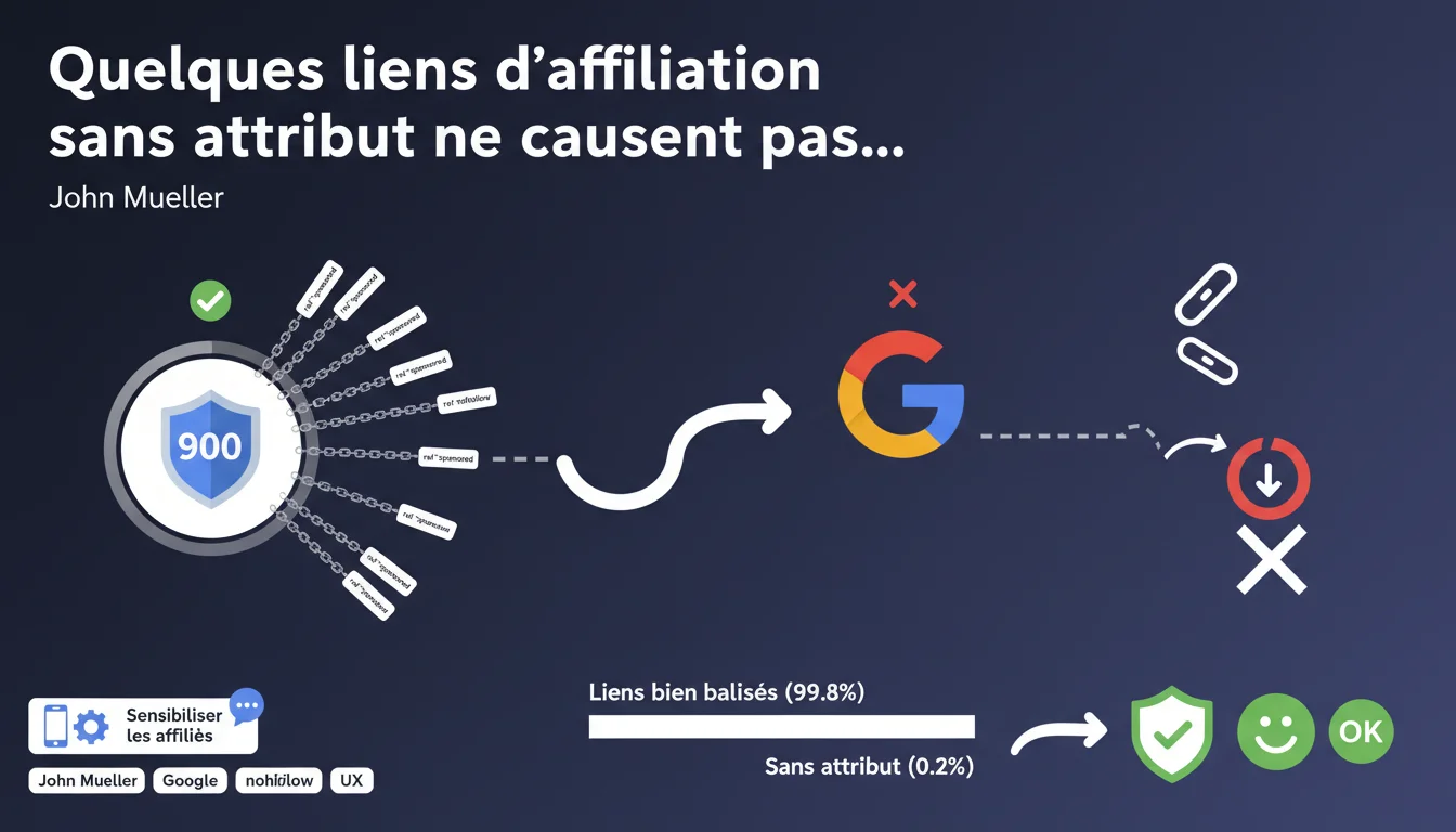 Google tolère un petit nombre de liens d'affiliation non balisés si la majorité respecte les attributs rel='sponsored' ou nofollow. Un site avec 900 liens correctement marqués et 2 sans attribut ne sera pas pénalisé. L'enjeu reste la sensibilisation des affiliés aux bonnes pratiques.