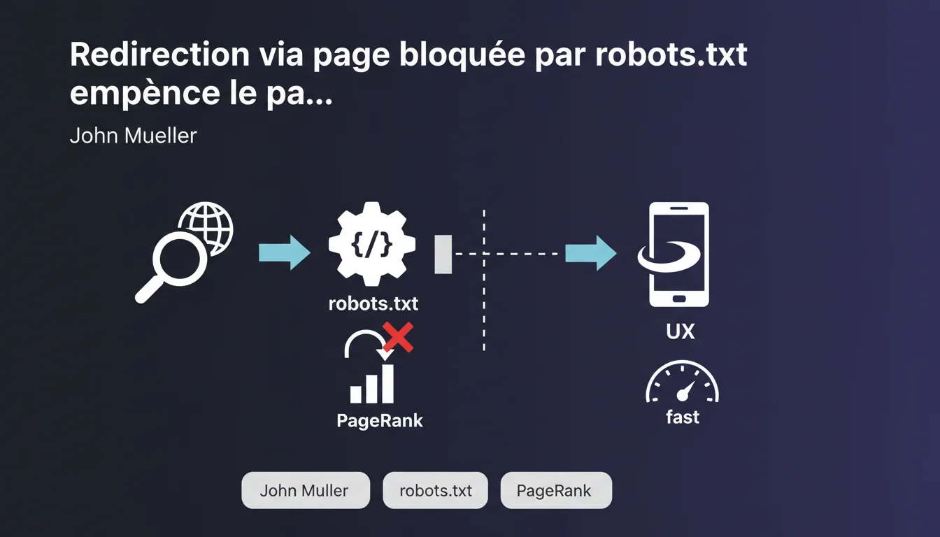 Google confirme qu'une redirection passant par une page bloquée via robots.txt empêche effectivement la transmission des signaux de PageRank. Concrètement, si vous ne voulez pas qu'un lien transmette son jus, intercaler une page intermédiaire bloquée au crawl fait le job. Une technique qui existe depuis des années, maintenant validée officiellement.