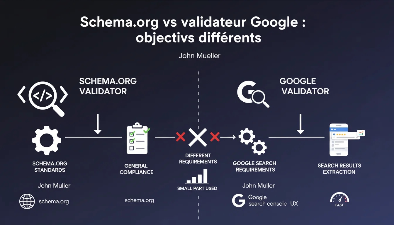 Google n'utilise qu'une fraction du balisage schema.org et applique ses propres règles de validation. Le validateur schema.org vérifie la conformité technique générale, tandis que Search Console indique ce que Google extrait réellement pour l'affichage dans les SERP. Un balisage parfaitement valide selon schema.org peut donc être ignoré ou rejeté par Google.