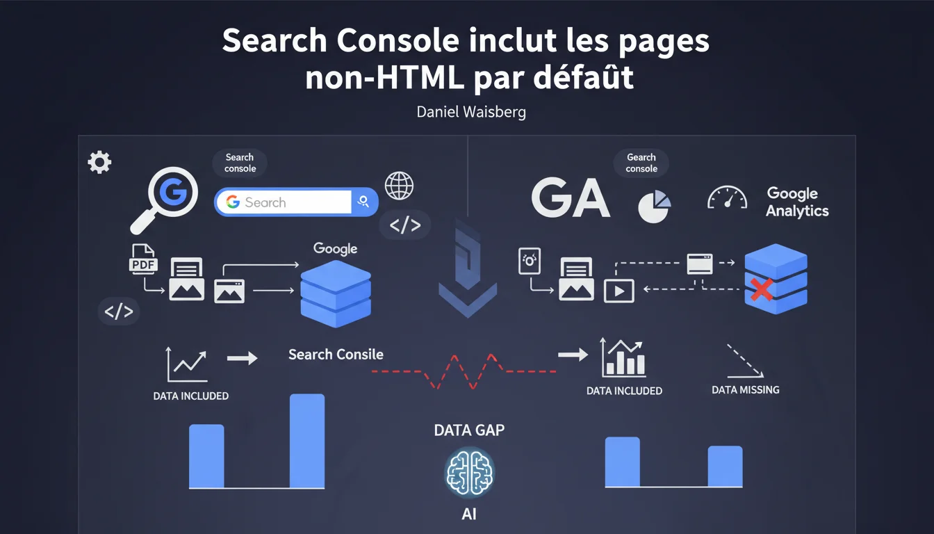 Search Console inclut automatiquement les pages non-HTML (PDF, fichiers Excel, documents texte) dans ses rapports si elles génèrent des impressions ou des clics dans la recherche Google. Analytics, lui, ne mesure ces fichiers que si vous avez explicitement configuré le tracking pour ces types de contenus. Cet écart structurel explique pourquoi vos données de trafic ne correspondent jamais entre les deux outils.