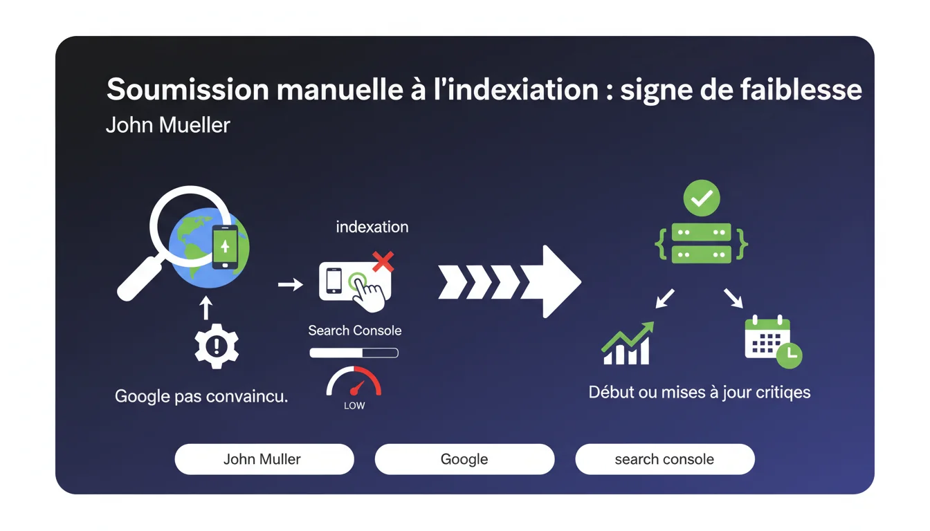 Selon Mueller, soumettre régulièrement des pages à l'indexation via Search Console révèle que Google doute de la qualité du site. L'outil ne garantit ni l'indexation ni le positionnement — il devrait servir uniquement au lancement d'un site ou pour des mises à jour critiques ponctuelles.