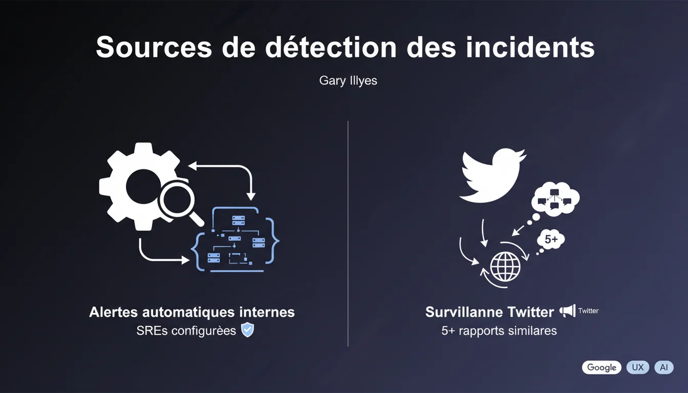 - Deux canaux de détection : alertes automatiques SRE et surveillance Twitter (5+ rapports similaires)