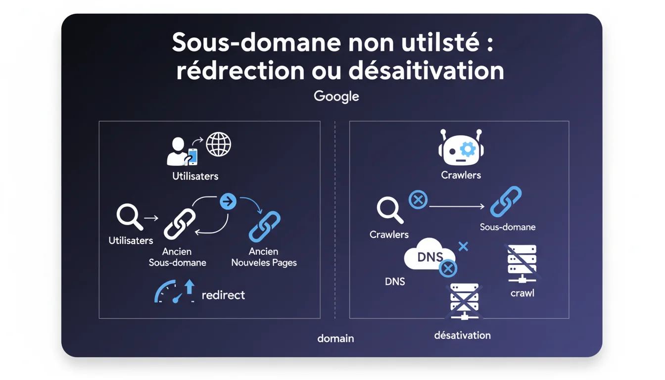 La logique est simple : l'expérience utilisateur prime. Si quelqu'un tape l'URL de votre ancien sous-domaine ou clique sur un lien externe pointant vers lui, il doit atterrir quelque part de pertinent — pas sur une erreur 404 ou DNS. C'est pour ça que Google recommande la redirection dans ce cas.