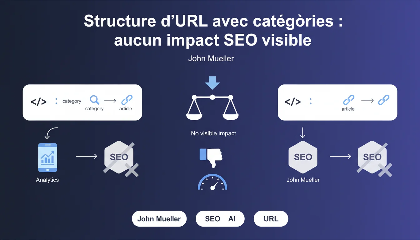 Selon Mueller, structurer vos URL avec des catégories (/category/article) n'apporte aucun bénéfice SEO mesurable comparé à une structure plate (/article). L'intérêt reste purement organisationnel — utile pour le tracking analytics, mais sans impact visible sur le classement. Une déclaration qui remet en question des années de pratiques établies.