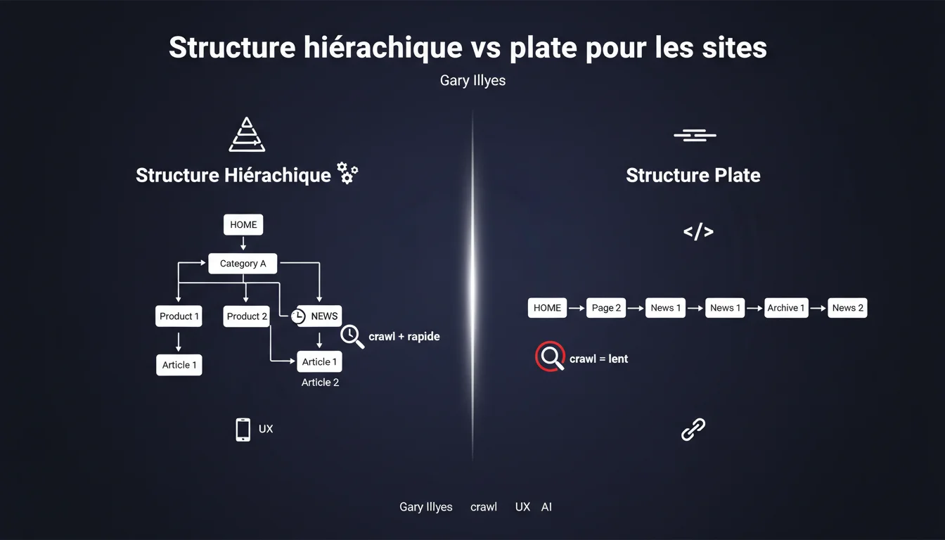 La réponse de Gary Illyes est claire : la structure hiérarchique offre un levier de contrôle du crawl que la structure plate ne permet pas. Concrètement, en isolant vos contenus dans des répertoires dédiés (/news/, /blog/, /produits/), vous donnez des indices structurels à Googlebot pour adapter sa stratégie de crawl.