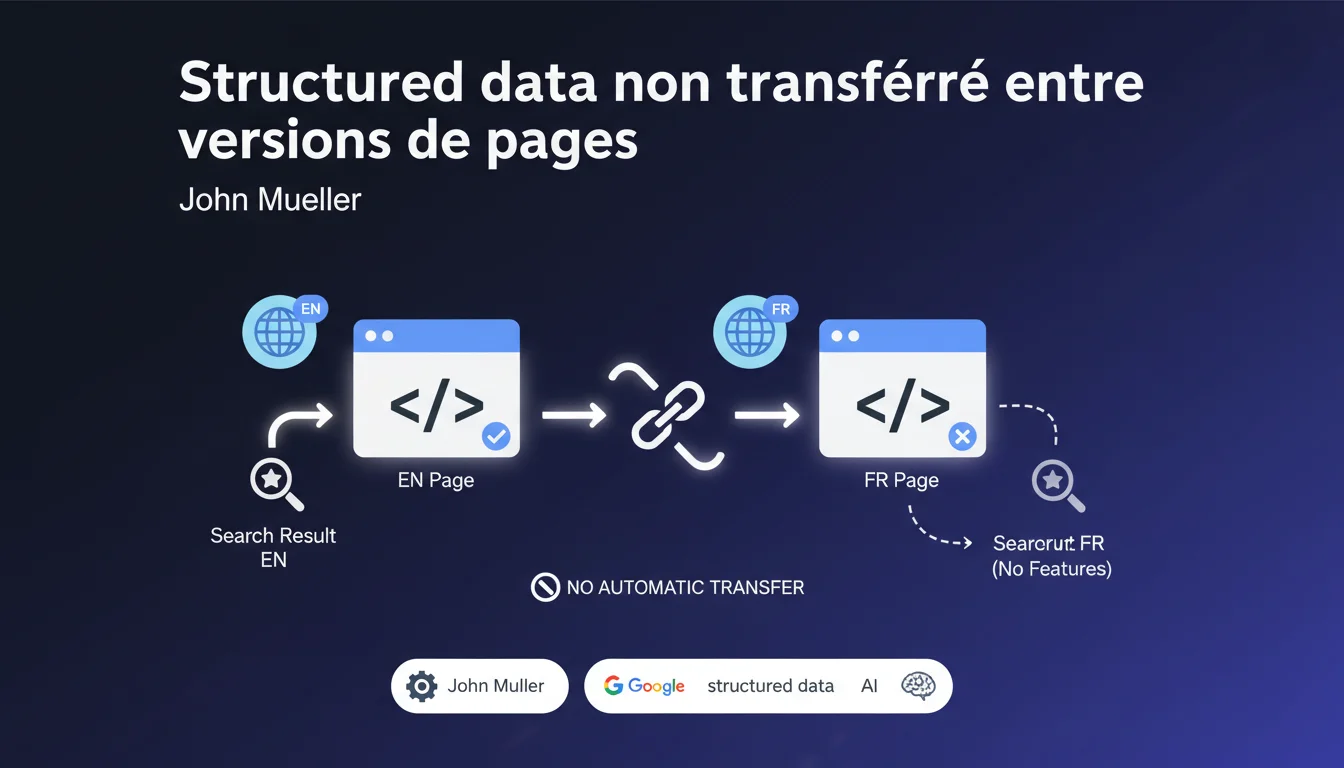Google ne transfère pas automatiquement les données structurées entre versions de pages (notamment localisées). Chaque URL doit intégrer son propre balisage Schema.org si vous visez des résultats enrichis. Oublier ce principe, c'est risquer de perdre rich snippets, FAQ ou produits structurés sur vos variantes linguistiques ou régionales.