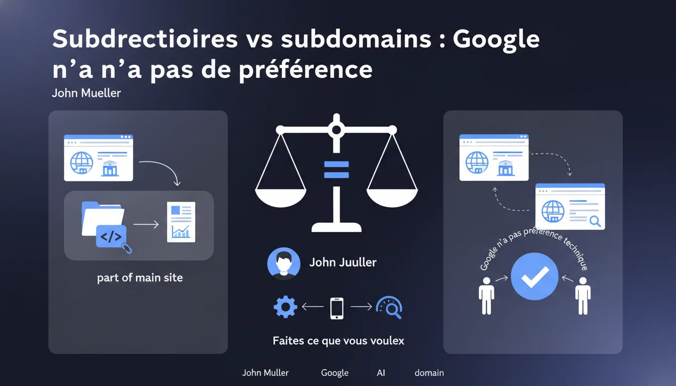 Google affirme n'avoir aucune préférence technique entre sous-domaines et sous-répertoires. Cependant, Mueller reconnaît que les sous-répertoires bénéficient d'une perception plus forte d'appartenance au site principal. Cette nuance change tout pour la stratégie SEO.