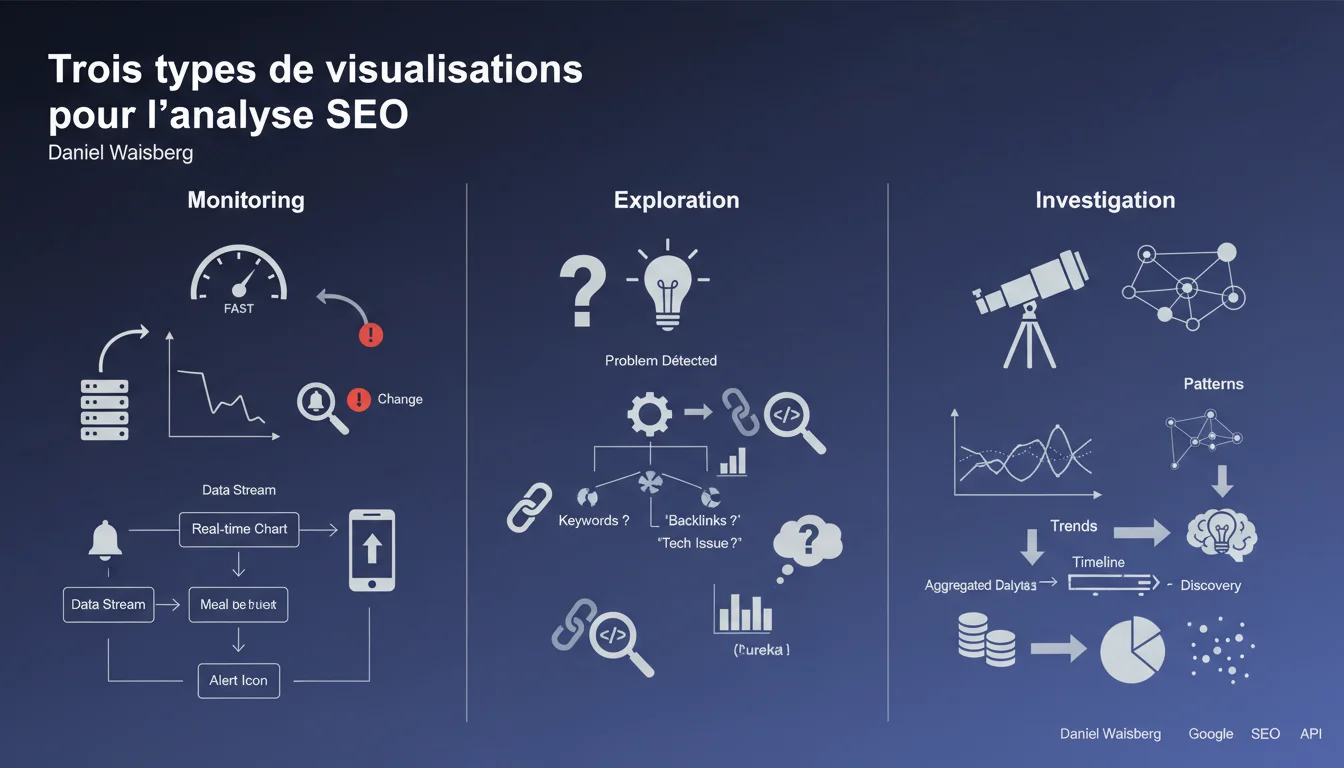 Google identifie trois usages distincts pour les visualisations de données SEO : le monitoring (détection rapide d'anomalies), l'exploration (compréhension des causes d'un problème), et l'investigation (identification de patterns sur données agrégées). Chaque usage nécessite un type de visualisation adapté et une approche méthodologique spécifique.