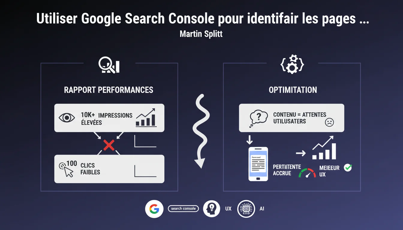 Martin Splitt recommande d'utiliser le rapport Performances de Google Search Console pour repérer les pages avec beaucoup d'impressions mais peu de clics. Ce décalage signale un problème d'adéquation entre votre contenu et les attentes réelles des utilisateurs pour ces requêtes.
