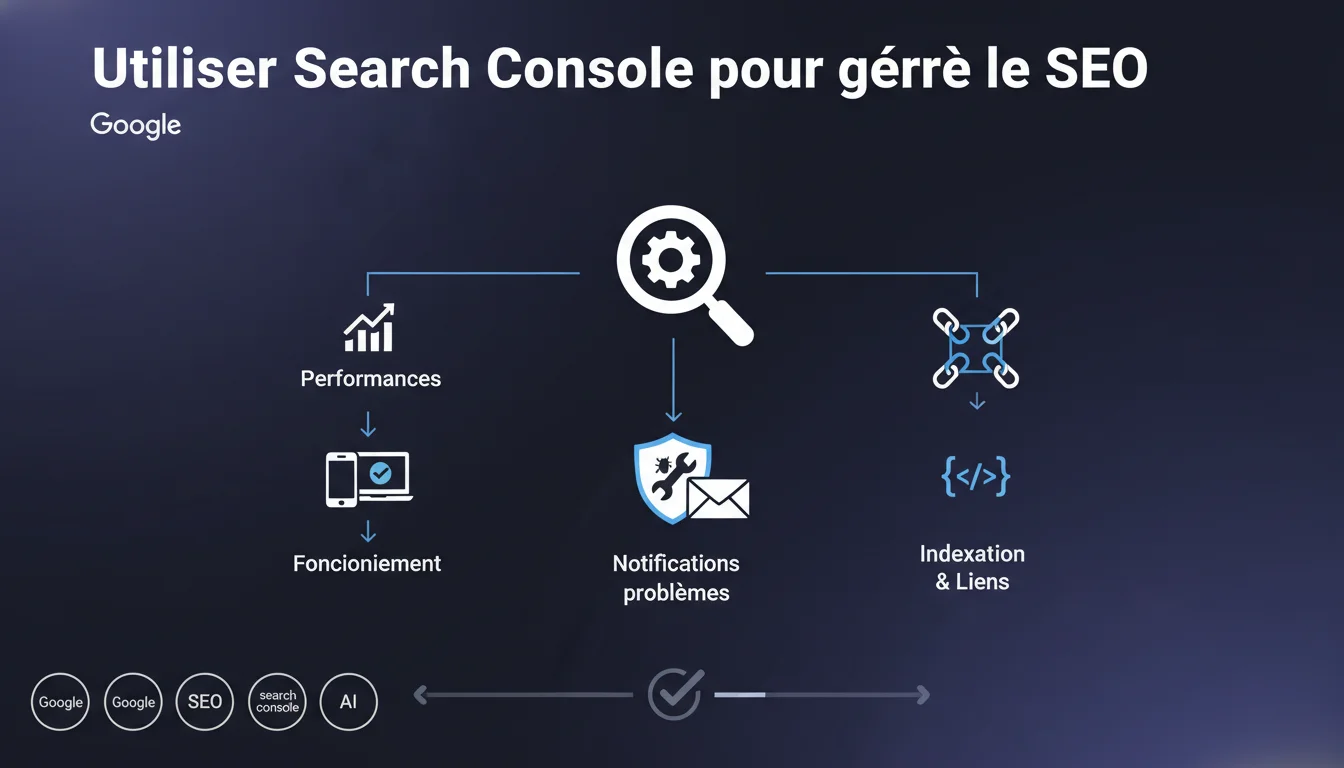Google positionne Search Console comme la solution centrale pour gérer le référencement d'un site. L'outil permet de suivre les performances organiques, de vérifier le bon fonctionnement technique et de recevoir des alertes en cas de dysfonctionnement.