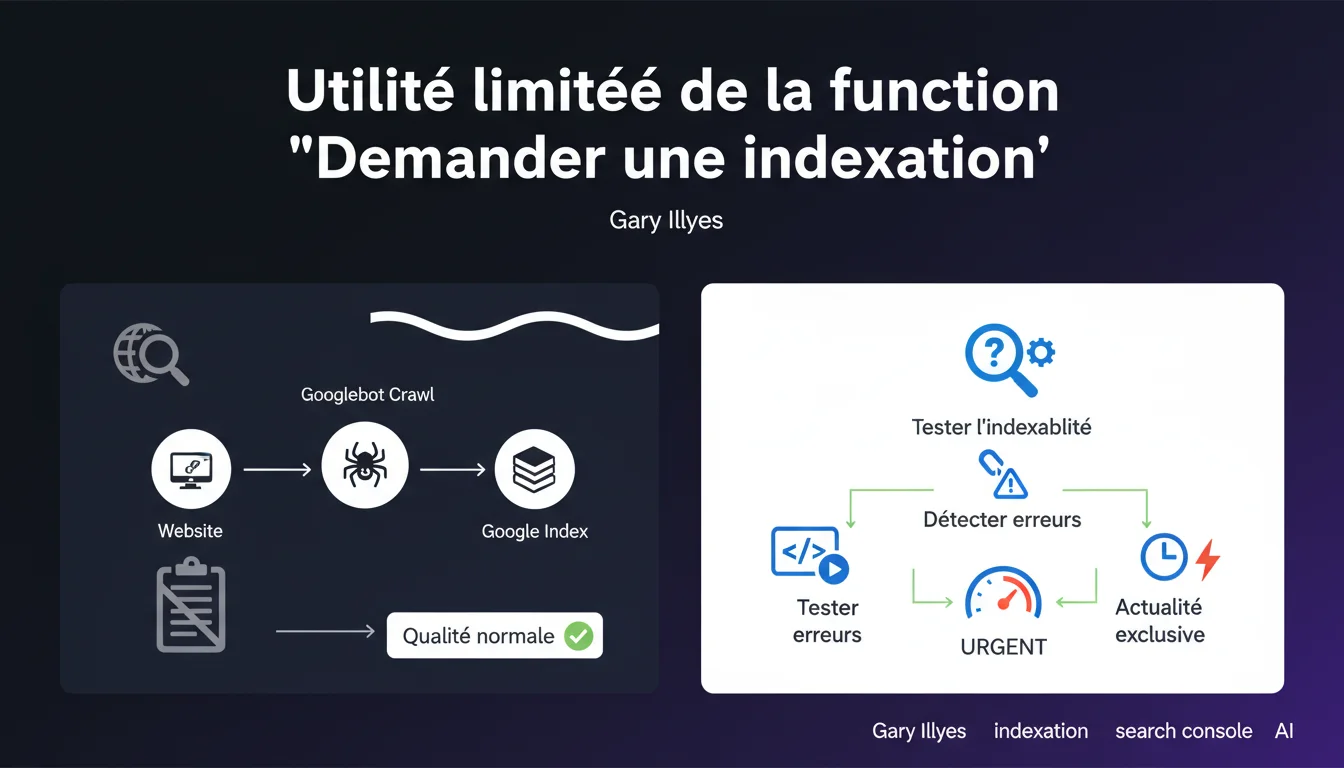 Gary Illyes affirme que la fonction 'Demander une indexation' n'est généralement pas nécessaire pour un site de qualité normale. Elle sert surtout à diagnostiquer des problèmes d'indexabilité ou à gérer des cas urgents comme une actualité exclusive. Pour le reste, le crawl naturel suffit.