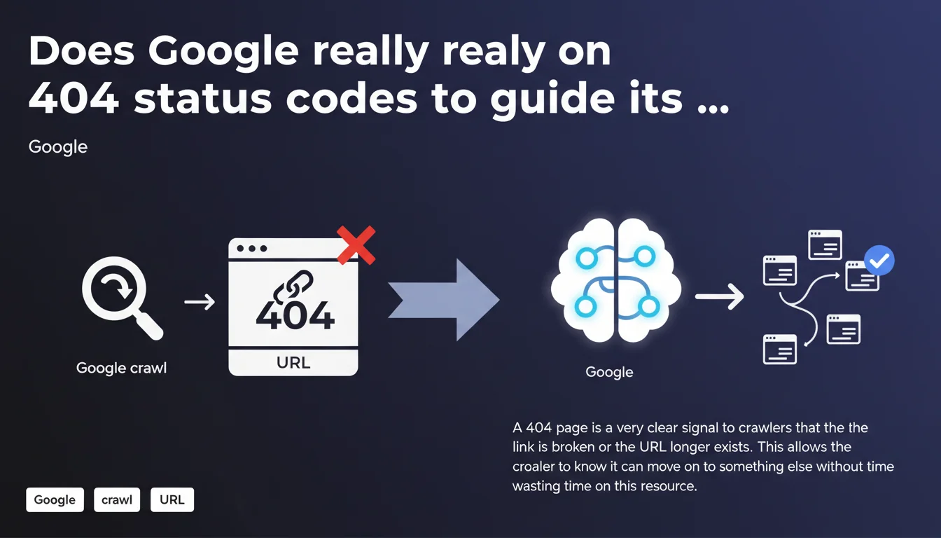 A clean 404 speeds up the crawl process. Google immediately knows it can remove this URL from its index or stop attempting to crawl it regularly. This frees up bandwidth for pages that really matter.