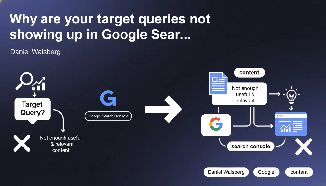 Google delivers an unambiguous diagnosis: if the queries you're targeting don't appear in your Search Console reports, your content probably isn't relevant or comprehensive enough for those terms. This statement from Daniel Waisberg reverses the burden of proof — it's not Google missing your content, it's your content that doesn't deserve to be displayed.