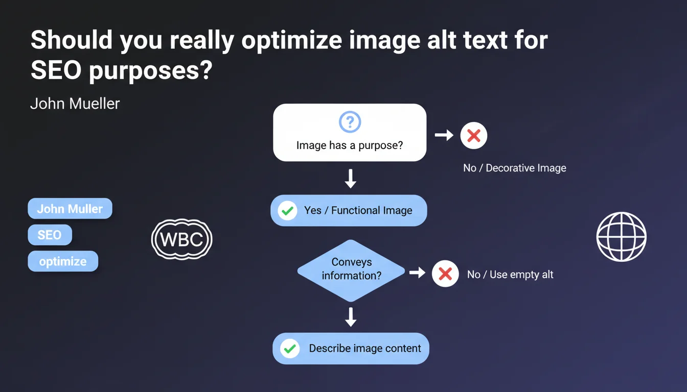 The search engine even shares the W3C decision tree that helps determine what type of alt text to use depending on the context and function of the image on the page.