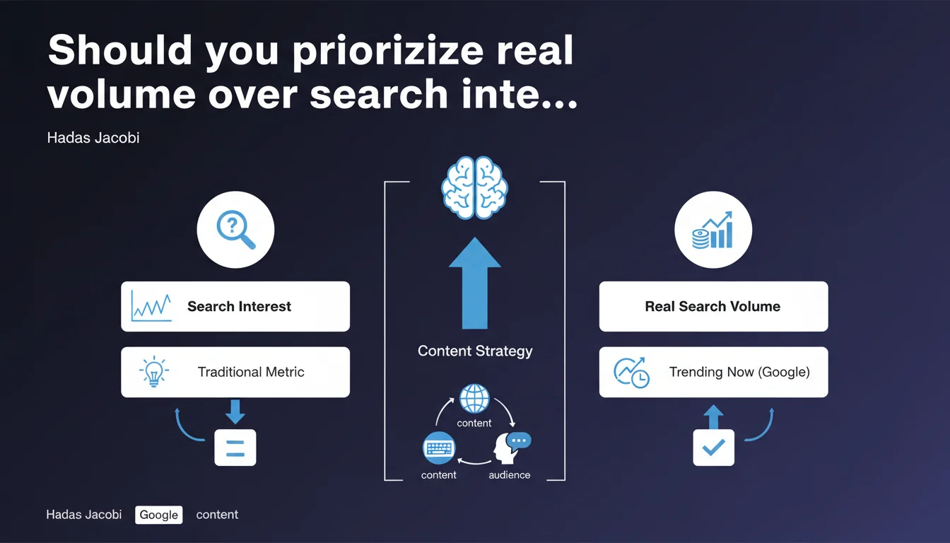 Real volume, on the other hand, serves to quantify the opportunity: how many potential visitors can I expect to capture if I rank for this topic? It's complementary, not substitutive. A smart SEO uses both in parallel.