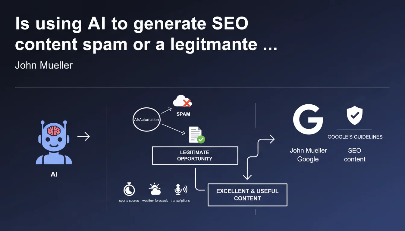 No, there's no dramatic reversal. John Mueller reminds us of a principle that has existed for years: automation is not automatically spam. Sites that automatically generate sports results, weather bulletins or video transcriptions are not penalized — because they meet a user need.