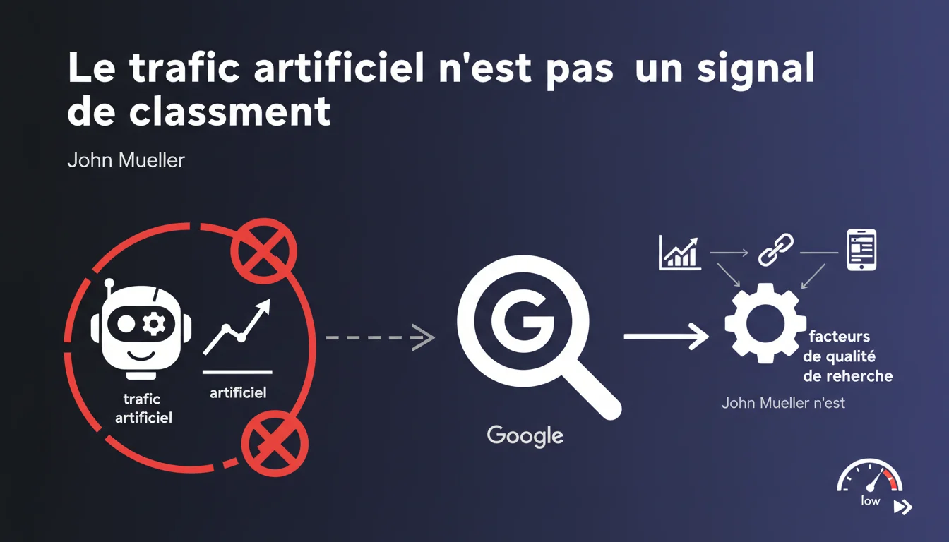 Some SEO tools <\/strong> and services promise to improve rankings by generating artificial traffic to a site. The idea? To convince Google that a page is popular so that it gets promoted in the results.<\/p> Mueller cuts to the chase: bot traffic is not a ranking signal <\/strong>. Google does not analyze the visitor volume of a site to decide if it deserves better positioning. The algorithms focus on other criteria—content, backlinks, user experience, etc.<\/p> We’re talking about bots, fraudulent paid clicks, automated scripts <\/strong> that simulate visits. Not legitimate advertising traffic (Google Ads, Meta Ads), nor real organic or direct traffic.<\/p> The problem with these tactics? They can distort your analytics, waste your server resources, and—in the worst case—trigger penalties if Google detects manipulation <\/strong>.<\/p> Mueller mentions an accidental correlation <\/strong>. A site that buys bot traffic may also, at the same time, improve its content, gain new backlinks, or optimize its Core Web Vitals.<\/p> It’s this parallel improvement that explains the rise—not the bots. Confusing correlation with causality is a classic trap in SEO.<\/p>What exactly do we mean by “artificial traffic”? <\/h3>