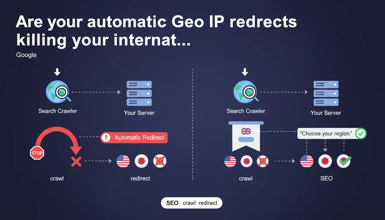 Google explicitly advises against automatic Geo IP redirects for multilingual or multi-regional sites. These redirects trap crawlers on a single site version, preventing proper indexing of alternatives. The recommended solution: banners or pop-ups that let users choose their preferred version.