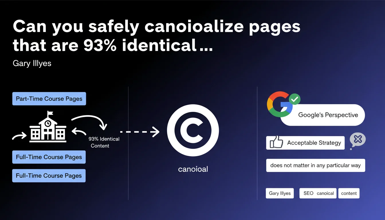 Gary Illyes confirms that it is acceptable to canonicalize pages with 93% identical content (in this case, part-time courses towards full-time courses). Google sees no particular issue with this approach. This statement validates a common field practice used to manage quasi-duplicate content that is structurally similar.