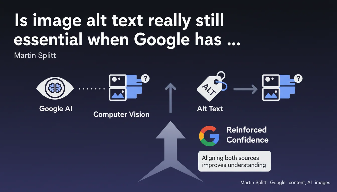 Where it gets interesting is for sites that neglected alt text thinking "Google can see the image anyway." Splitt confirms that's not true — missing alt means losing a reinforcement signal. It's not a blocker, but it's wasted potential.