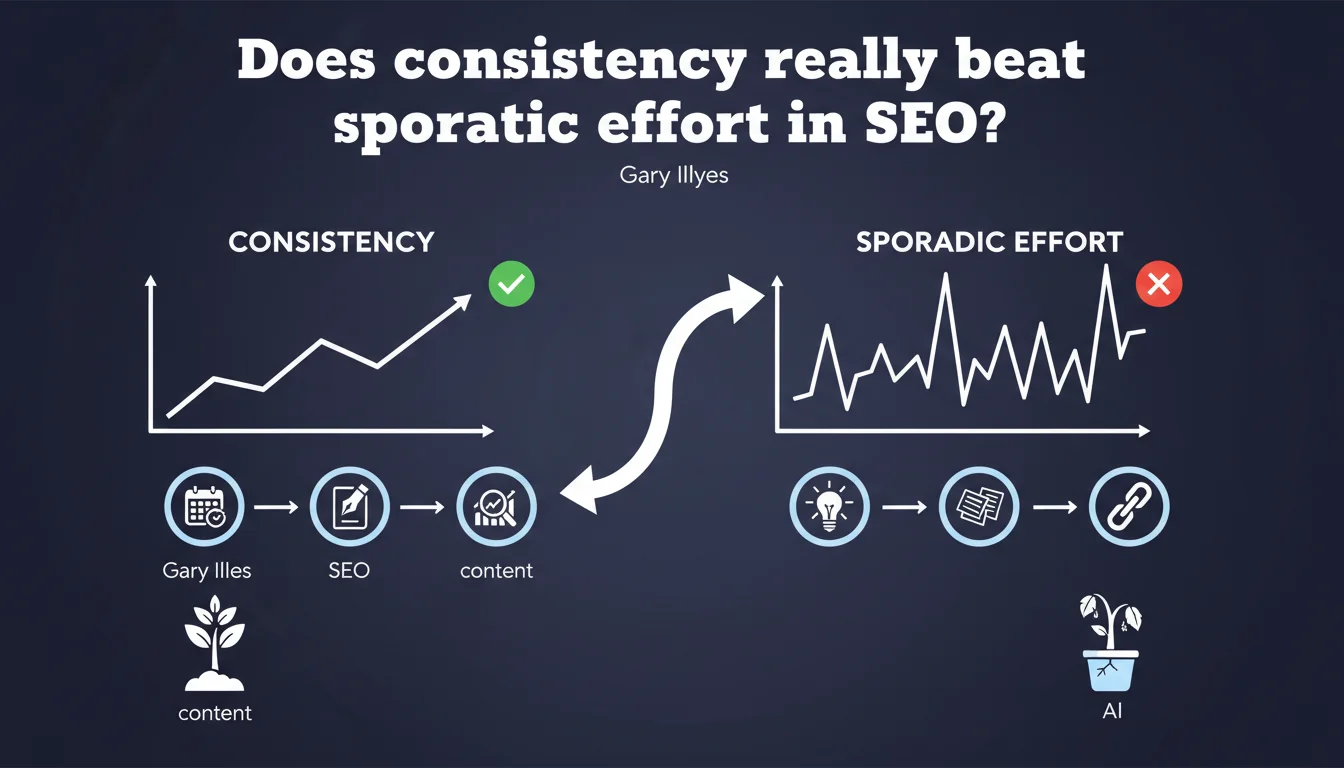 Gary Illyes asserts that consistency trumps massive one-off efforts in SEO. It's better to publish regularly and stay on top of SEO news consistently than to produce a ton of content all at once and then disappear. A reminder that challenges publish-in-bursts strategies.