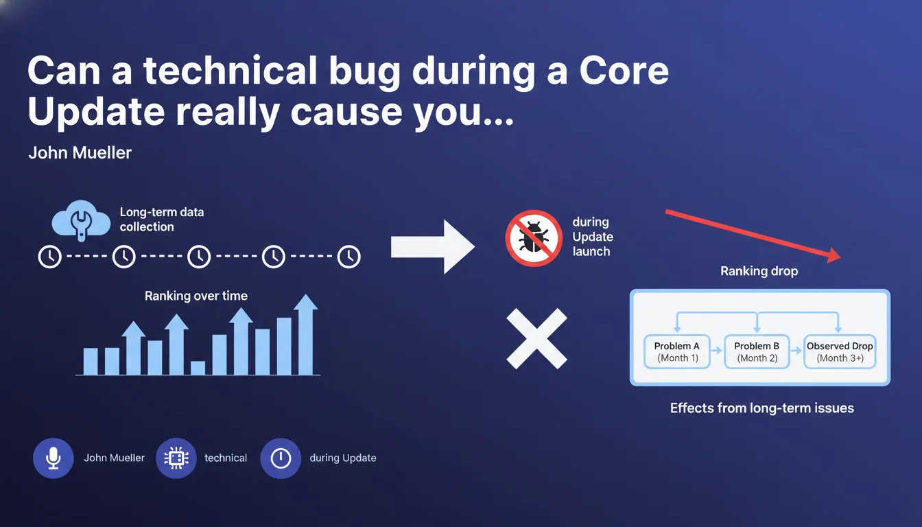 Mueller is responding here to a persistent belief in the SEO community: the idea that a technical bug occurring at the wrong time — during the rollout of a Core Update — could trigger a visibility disaster.