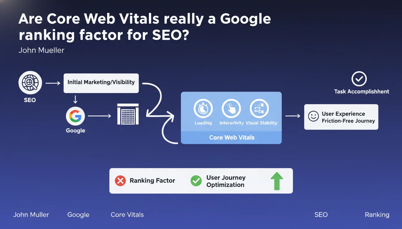 Mueller clearly separates two dimensions: discoverability (ensuring a site gets found, indexed, and ranked) and user experience (what happens once the user clicks). Core Web Vitals, according to him, fall exclusively into the second category.