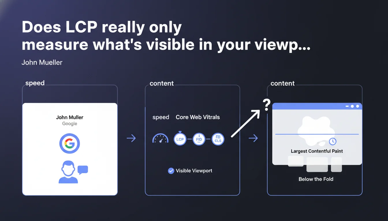 Google confirms that Largest Contentful Paint (LCP) measures exclusively the rendering time of the largest visible element in the initial viewport, not what lies below the fold. Priority optimization should therefore focus on above-the-fold content. Resources loaded outside the viewport don't directly impact this score — but watch out for hidden dependencies.