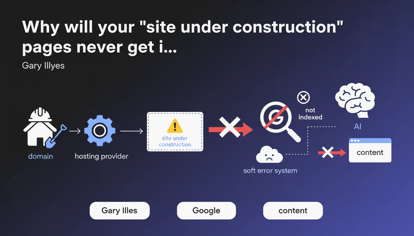 Where it breaks down — and Google won't tell you this — is with small regional hosting providers or custom templates. If your hosting provider uses a unique design for their construction pages, there's a window where Google might temporarily index before understanding. [To be verified] on larger samples, but on-the-ground observation suggests a very low false negative rate.