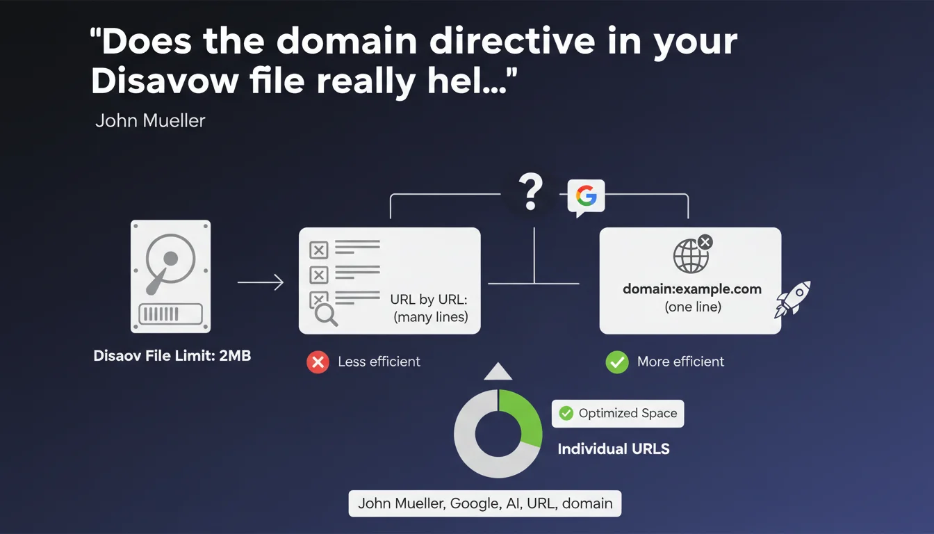 Google enforces a strict 2MB limit on Disavow files. To avoid exceeding it, Mueller recommends using the domain directive (domain:) rather than listing each URL individually. This approach optimizes space and simplifies managing massive disavowals.