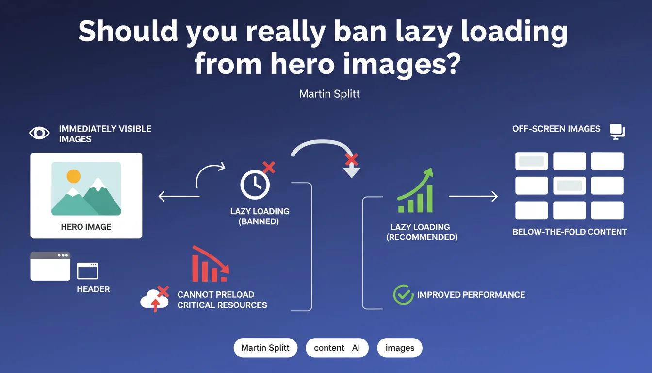 Lazy loading works by delaying image downloads until they approach the viewport. It's excellent for saving bandwidth and speeding up initial page load — except when applied to critical images.