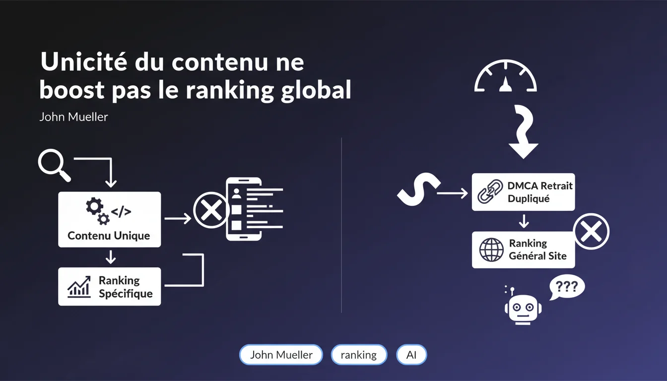 Mueller's statement debunks a persistent myth: having unique content does not guarantee better overall ranking <\/strong>. Uniqueness serves as a relevance filter, not as a visibility multiplier.<\/p> In practical terms, if you publish a fresh angle on a topic, you won't rank better for generic queries — only for those targeting that specific angle. Generic queries — the ones that drive traffic — won't receive an automatic boost simply because you have 10% original content on your site.<\/p> Google treats search intents differently. A broad query ("car insurance") triggers complex ranking signals: domain authority, thematic depth, UX signals <\/strong>. Content uniqueness is just one factor among dozens of others.<\/p> Conversely, an ultra-specific query ("car insurance comparison for Tesla Model 3 in rural areas") drastically reduces competition. Here, uniqueness becomes critical — simply because few sites cover that precise angle.<\/p> Mueller is categorical: removing duplicate content via DMCA does not enhance overall ranking <\/strong>. This clarification targets negative strategies aimed at "cleaning" the web of duplicates in hopes of climbing rankings.<\/p> The DMCA addresses plagiarism issues, not ranking issues. If your site is stagnant, it's probably not because 15 sites are reblogging your articles — you need to look elsewhere.<\/p>Why is there a distinction between generic and specific searches? <\/h3>