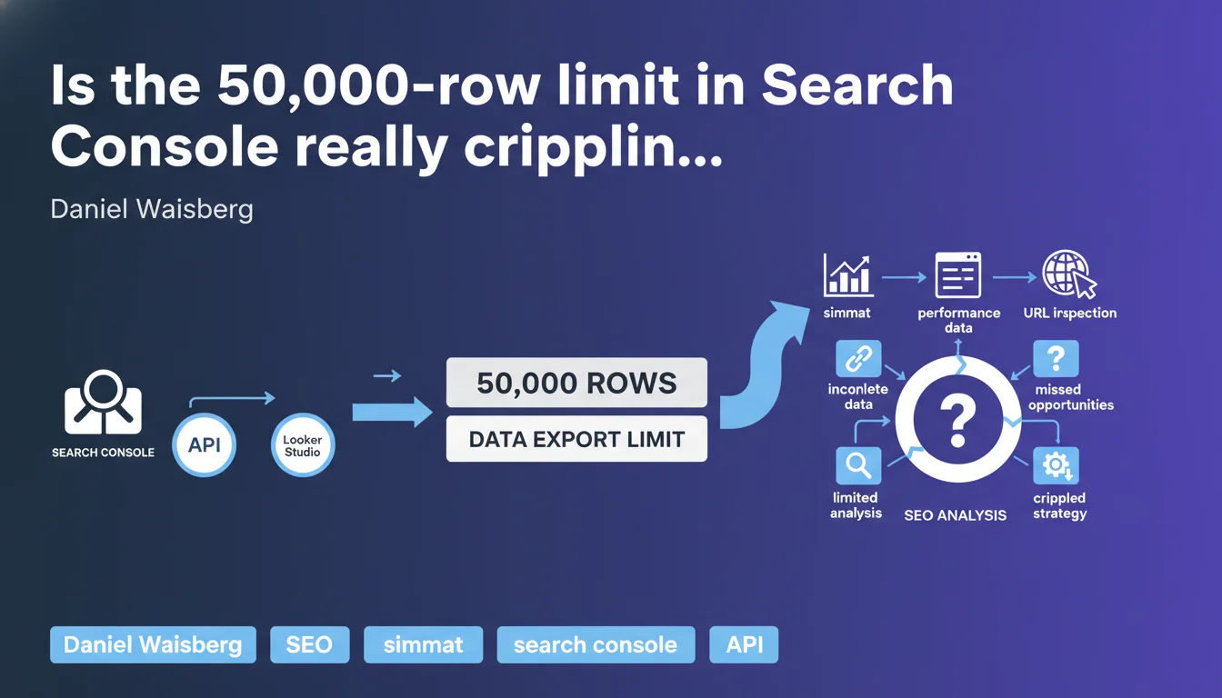 Google confirms that Looker Studio and Search Console API cap exports at 50,000 rows for performance data, URL inspection, sitemaps, and sites. This technical limitation forces you to filter or segment extractions, risking you miss critical insights on high-volume query sites.