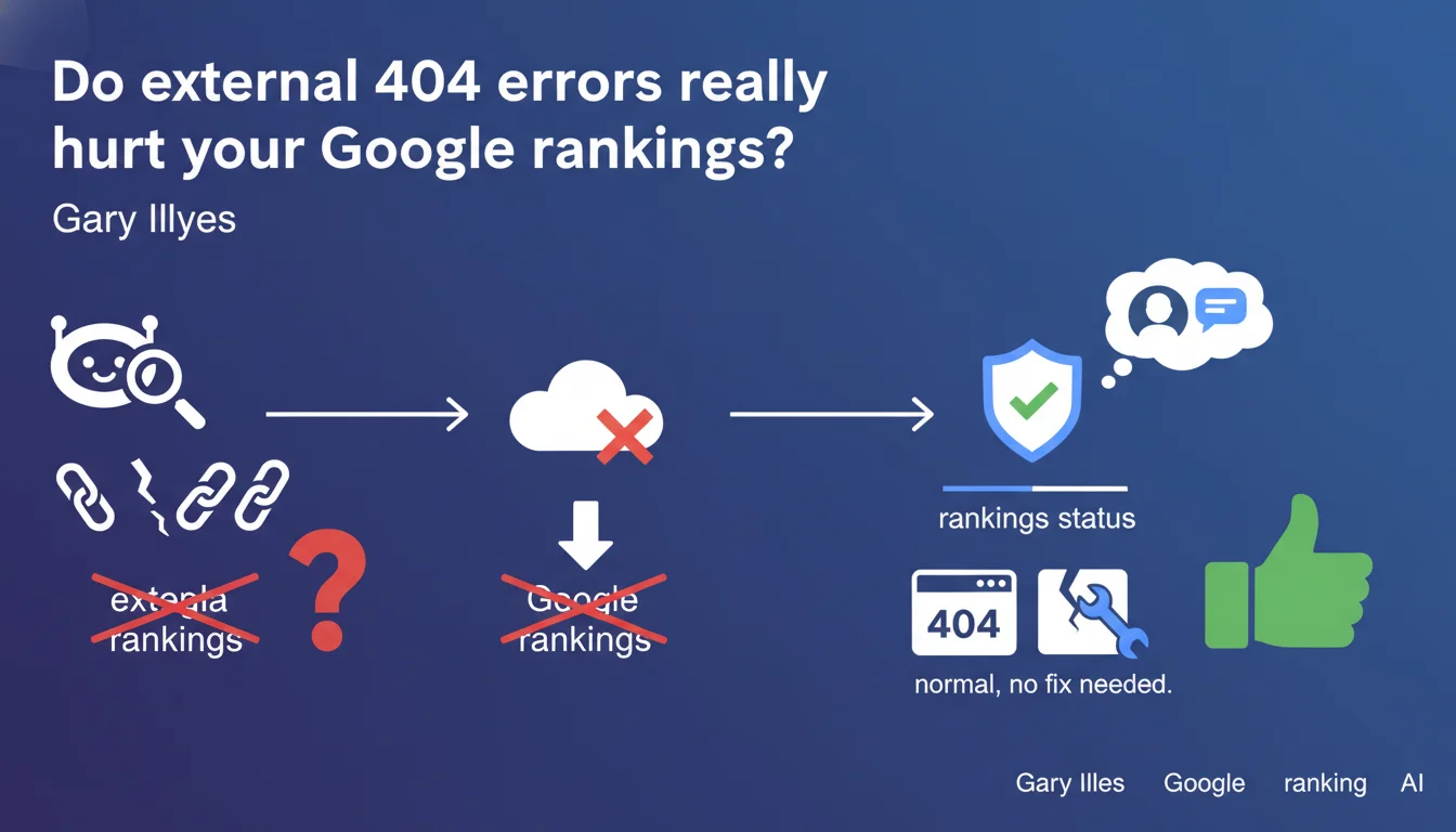 The nuance is important: this is not about internal 404s (your own deleted pages), but rather broken outbound links. Google clarifies that these errors — even in large volumes — do not penalize your rankings.