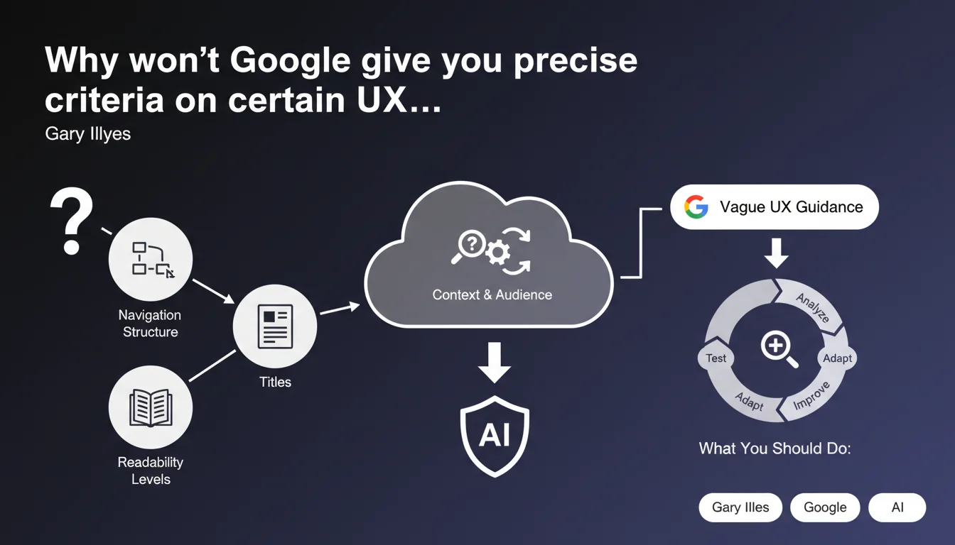 Google deliberately stays vague on UX criteria like navigation, titles, and readability levels. Their argument: these aspects depend too heavily on context and audience to be standardized. A position that leaves SEOs navigating gray zones—again.