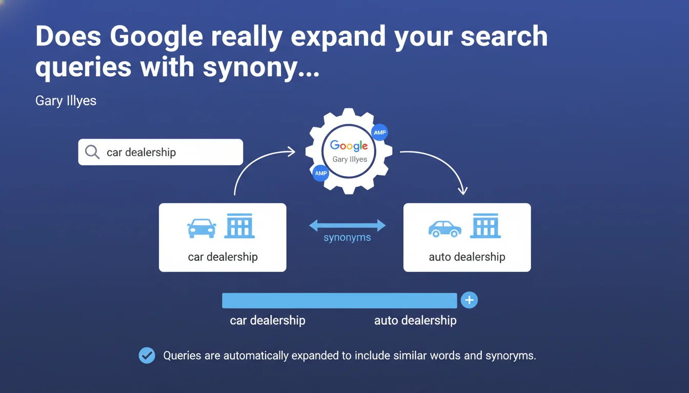 Google automatically applies semantic expansion to search queries by including synonyms and similar terms. A search for 'car dealership' therefore also includes 'auto dealership' without user intervention. This mechanism directly impacts how you should think about your keyword strategy and semantic coverage.