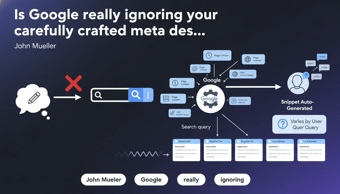 The nuance Mueller brings here: this generation is contextual. For the same page, the snippet can vary depending on the query that triggered it. Google tries to display the fragment most relevant to the user's intent, not necessarily the one you wrote.