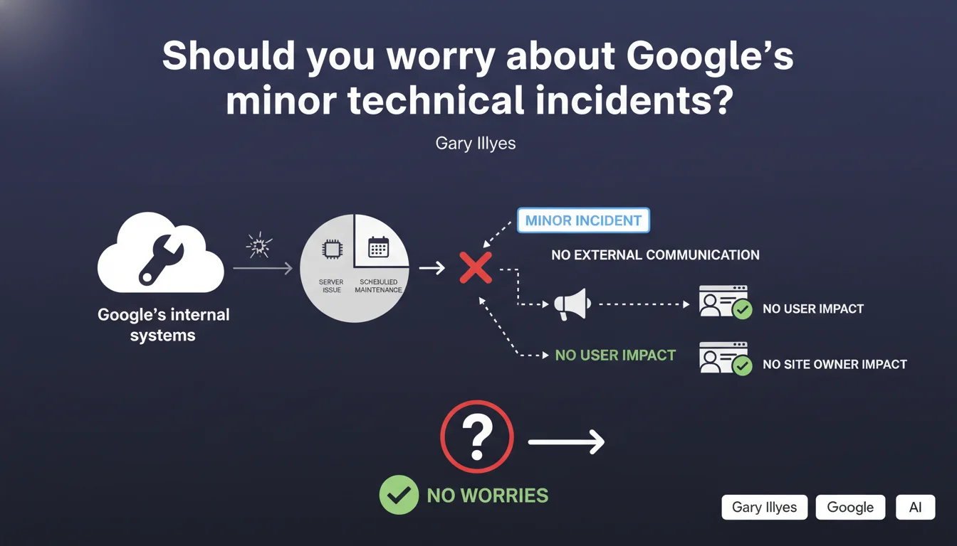 Google doesn't communicate about internal incidents classified as 'minor' — a server running low on RAM, datacenter maintenance — because they've never visibly impacted users or site owners. For SEOs, this means unexplained traffic fluctuations are probably not linked to these micro-outages that Google won't discuss.