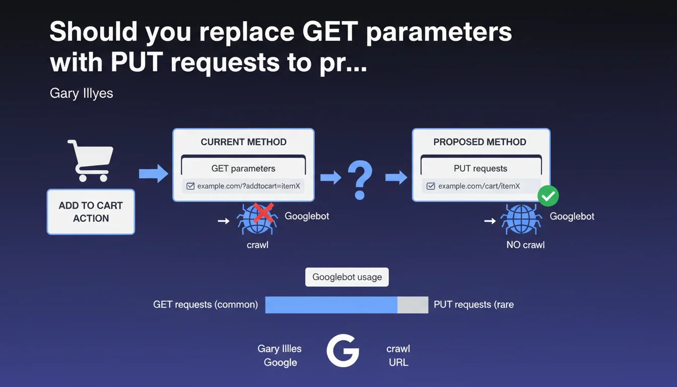 Googlebot very rarely uses HTTP PUT requests. Replacing GET parameters with PUT requests for actions like adding to cart would prevent these URLs from being crawled unnecessarily. A technical strategy to protect your crawl budget on e-commerce sites.