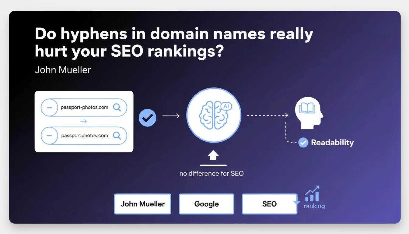 Mueller is talking about SEO in the strict sense — Google's algorithm. But a hyphenated domain can have indirect implications that need to be weighed.