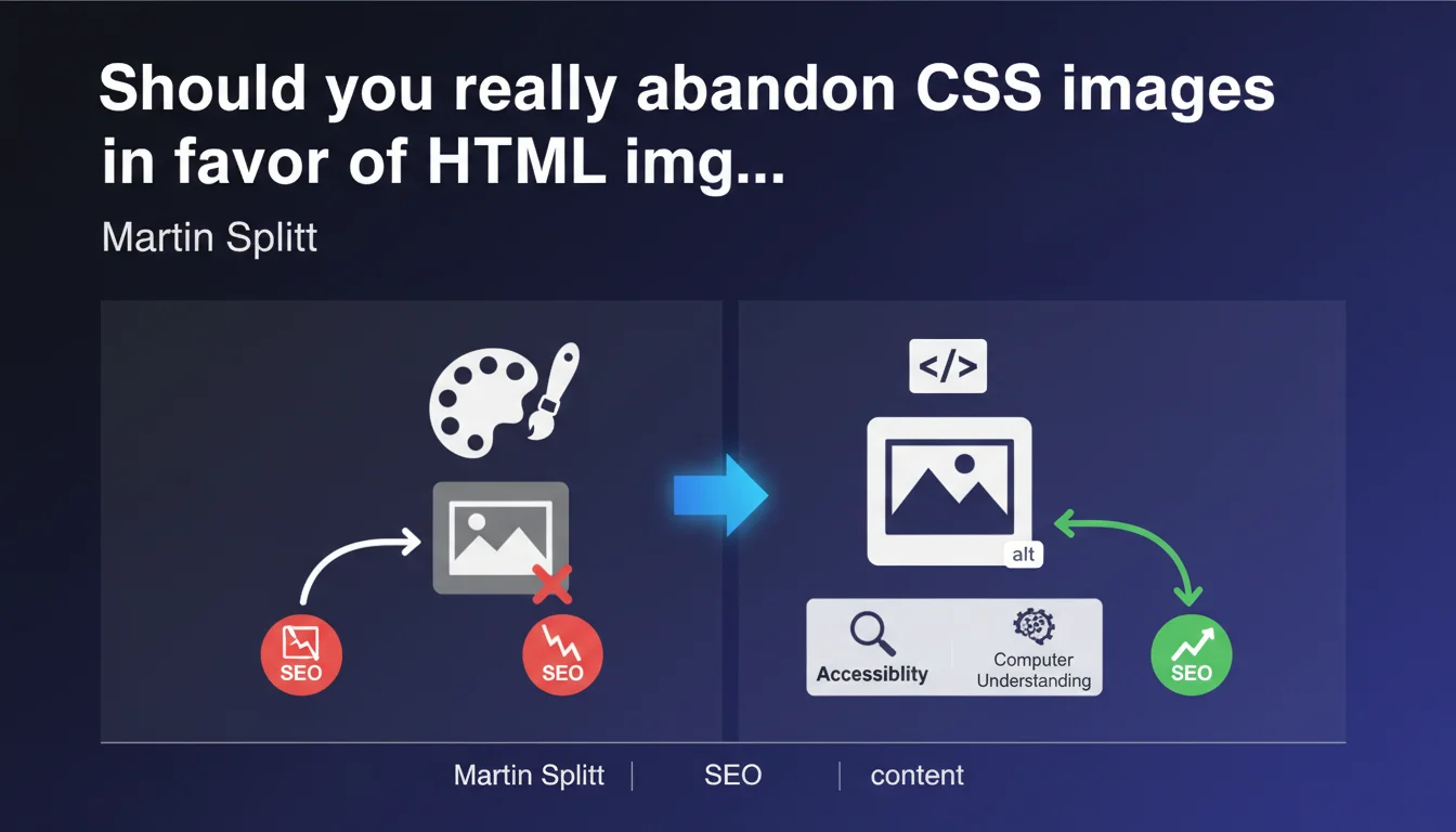 With an HTML tag, you have the alt attribute, placement context within the DOM, and a clear structure that algorithms can interpret. A CSS background image? That's a presentation element, not content — and Google treats it as such.