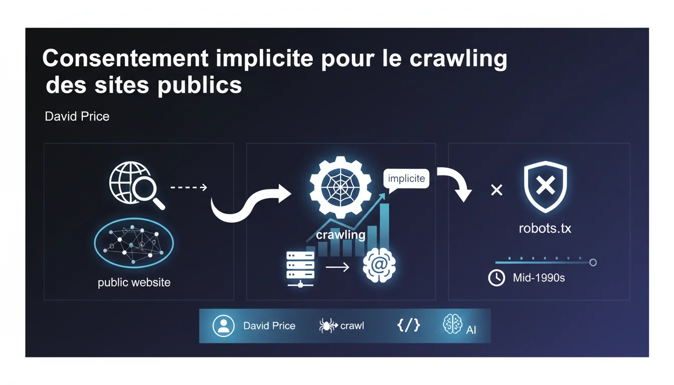 Google claims that a public site legally implies implicit consent for crawling, unless otherwise directed via robots.txt. This legal stance, upheld since the 90s, serves to justify the massive exploration of content without prior explicit authorization. For SEO practitioners, this means that robots.txt remains the only technical safeguard officially recognized by Google.