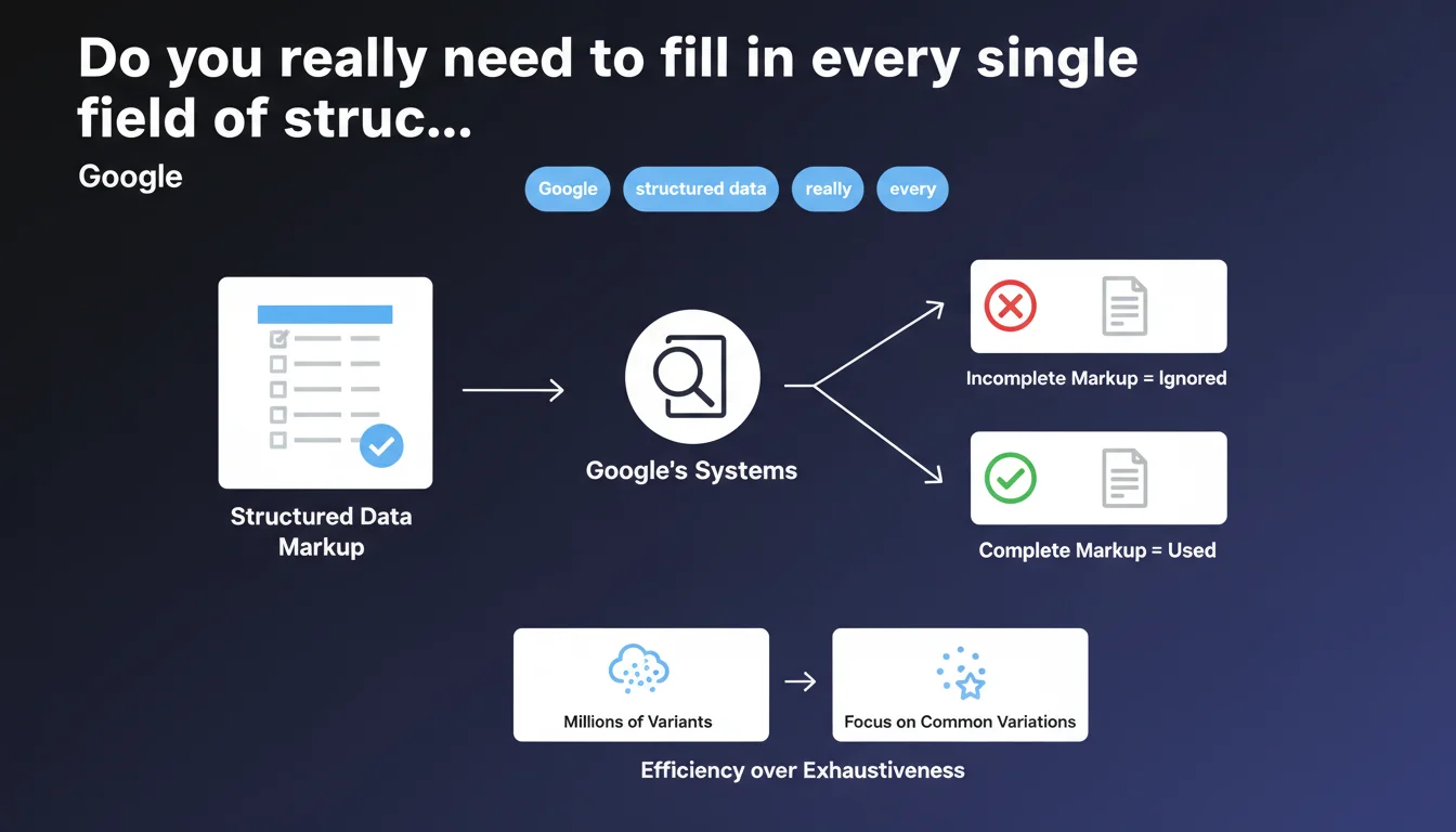 The recommendation is pragmatic: focus on the most common variations — the ones that drive traffic and conversions. Everything else can remain unmarkuped without penalizing the site as a whole.