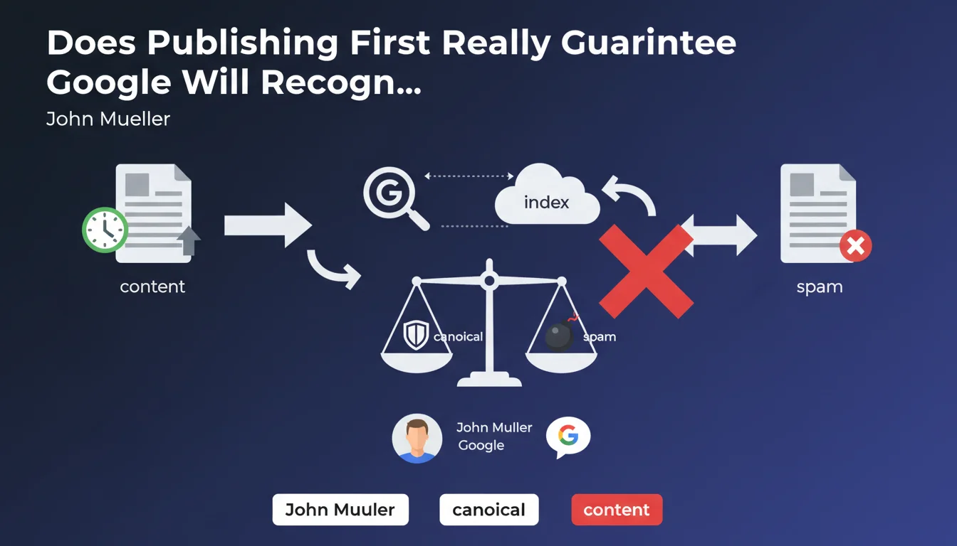 Google has clarified an important misconception: being indexed first doesn't make you the original author in the search engine's eyes. If a scraper or plagiarist copies your content and Google indexes it before your own page, that doesn't mean it will be considered the canonical source.