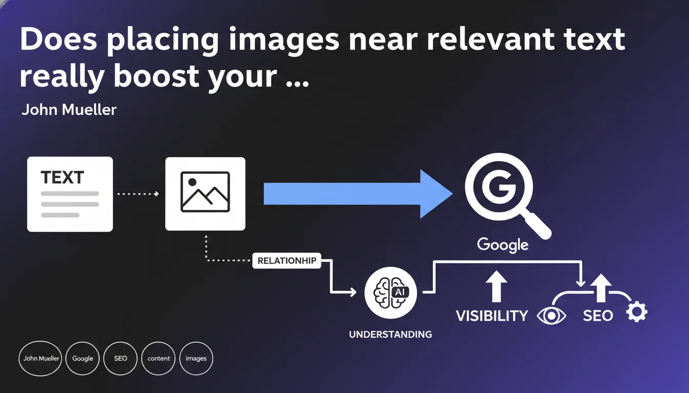 We're talking about proximity in the DOM, not necessarily visual proximity (though they often overlap). An image can be visually close to text via CSS but structurally distant in the HTML — and it's the HTML that Googlebot crawls.