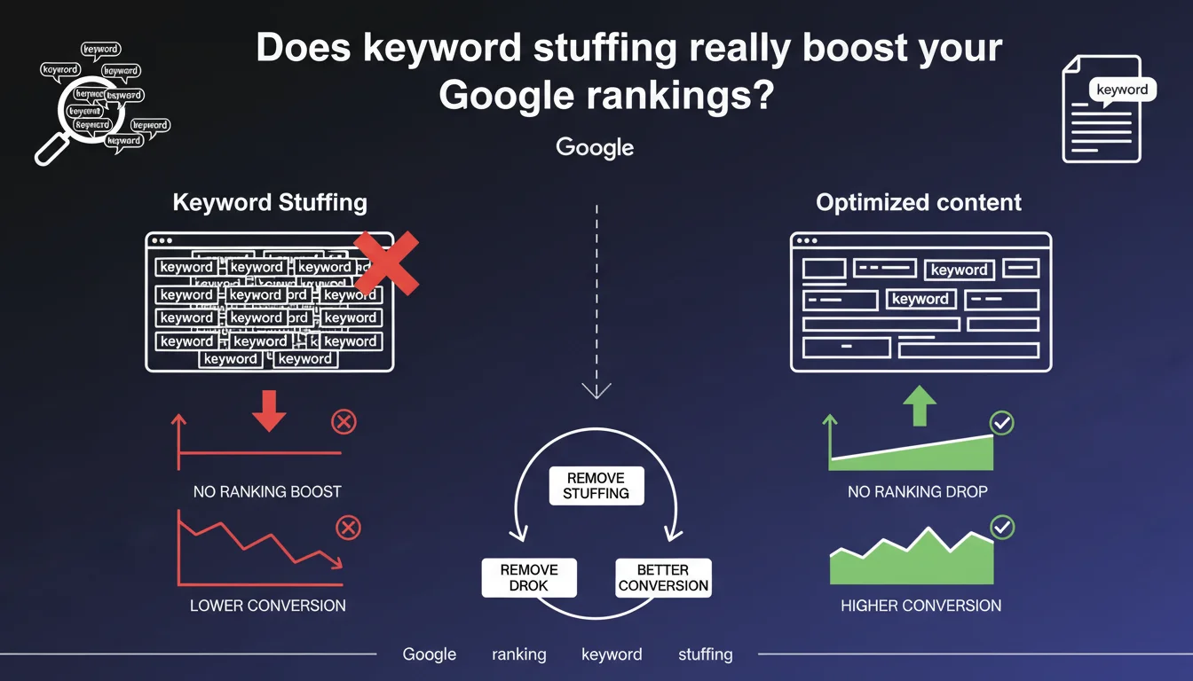Google confirms that cramming a page with keywords does nothing for ranking. A real case study shows that a site already well-ranked suffered no loss in position after removing keyword stuffing, while improving its conversion rate. The algorithm values relevance and user experience, not keyword density.