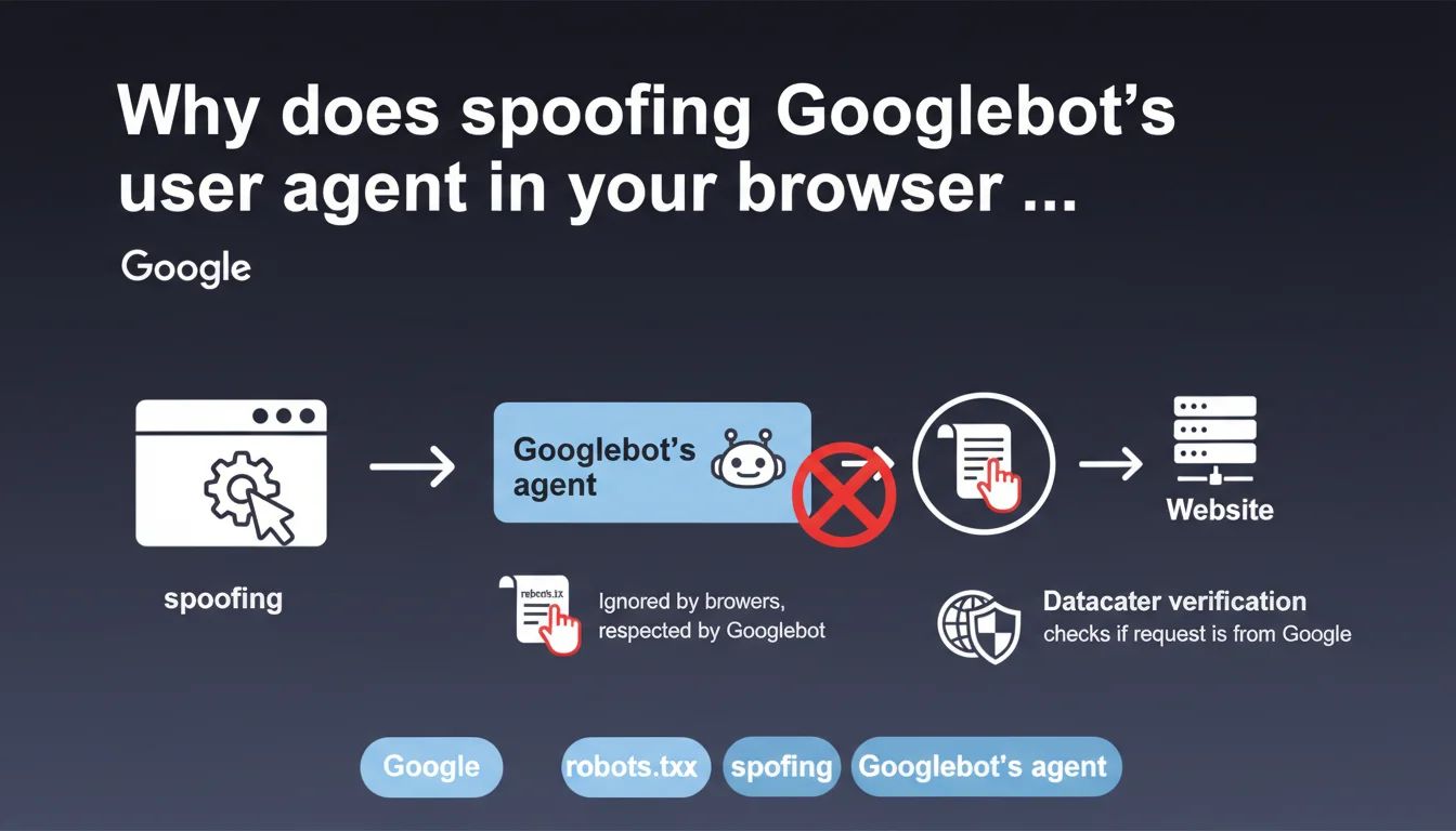 Many SEOs change their browser's user agent to mimic Googlebot, hoping to see exactly what the crawler sees. The idea? Quickly detect whether a page blocks the bot, displays different content (cloaking), or encounters JavaScript rendering issues.